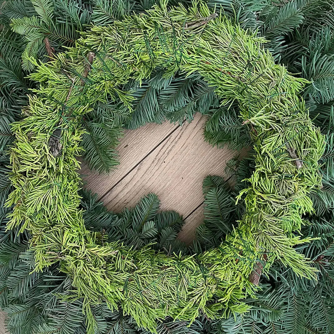 A freshly made, eye catching wreath that is hand made using fresh Noble Fir foliage from the farm.