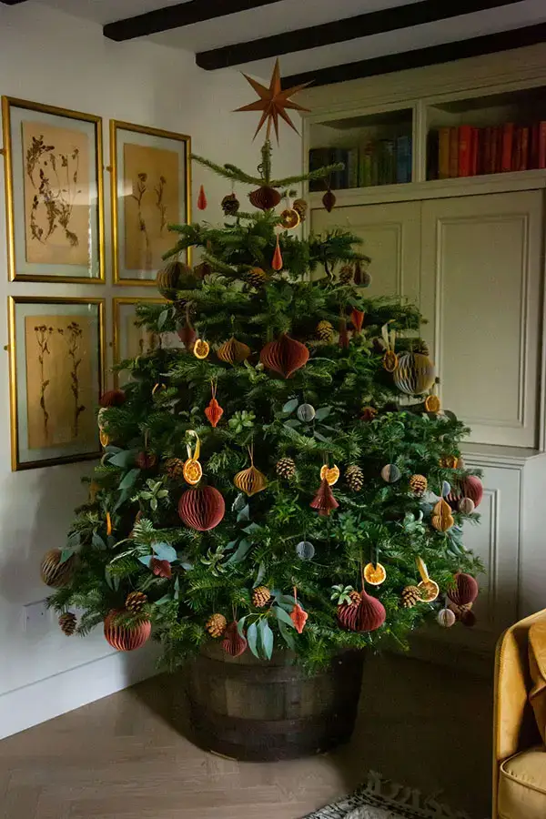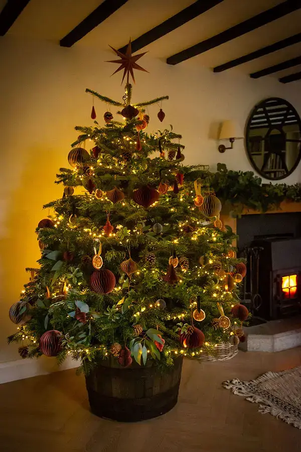 The Supreme Christmas Tree Bundle consists of an award-winning Nordmann Fir which comes in a beautifully crafted Oak whiskey half-barrel water reservoir stand, keeping your tree hydrated. Our team will install your tree, dress with warm white led lights which we supply, decorate with a unique blend of our decorations which are made from both natural and sustainable materials, take down in the New Year and brought back to our farm, where it will be chipped and used as bedding for the livestock. This popular tree variety is known for its reliably symmetrical shape, wide base, and beautiful dark green needles. All our trees are sustainably grown and handpicked to ensure you always receive a top-quality product. Please note that the oak barrel stand, decorations and lights are supplied on a rental basis only and remain property of Pines&Co.